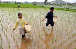 5月7日,江西于都縣車溪鄉車勝村農民正在給早稻追肥。