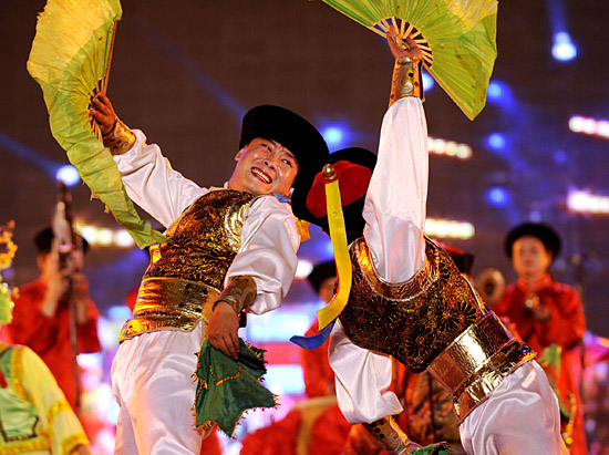 5月8日,參加東北大秧歌表演的演員正在開幕式上表演。