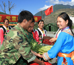 5月26日,羌族姑娘給解放軍官兵送來蔬菜和水果。當日,四川省茂縣的羌族姑娘為正在當地進行搶險救災的成都軍區某集團軍子弟兵送來蔬菜和水果,并主動幫戰士們洗衣服。