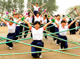 5月27日,“積極推進‘陽光工程’,促進學生體質健康發展論壇”在長春開幕,此次活動的重要內容之一是長春市雙陽區“陽光體育”成果展示。圖為長春市回族中學的學生在表演竹竿舞。