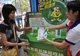 圖為一位市民(左)在廣州一家藥店里把廢舊藥品的外包裝盒放入回收箱后,得到一包藥作為獎勵。