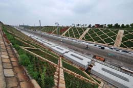 6月18日,幾位工人在武廣客運專線建設工地忙碌。武廣客運專線自從2005年上馬以來,同時注重鐵路沿線的生態綠化建設。鐵路兩邊山坡上的綠化,成了鐵路沿線的一道美麗風景。6月18日,幾位工人在武廣客運專線建設工地忙碌。