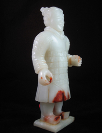 2008年10月,兩件海外回流文物將由北京中嘉國際拍賣公司公開拍賣,一件是戰國和田玉武士俑,另一件是戰國和田玉劍。 在傳世古玉器中,用新疆和田籽玉琢制而成的藝術品尤其珍貴。將要拍賣的戰國秦武士俑高23厘米,選用上等和田籽玉,玉質如羊脂般潔白細膩。俑身下部帶有朱砂紅泌、衣甲邊延有非常珍貴的只有和田籽玉才有的棗皮紅。人物莊重、肅穆的表情,體現了武士的威嚴和恭敬,且形象生動,服飾衣甲、發式均真實具體,人物臉部輪廓及紋飾線條極為流暢自然,傳神、生動,極具藝術魅力,體現了戰國時代琢玉藝人高超的工藝和非凡的藝術想象力。 另一件戰國和田玉劍為新疆和田籽料琢制,長49.8厘米,由劍首、劍莖、劍格、劍身所組成,劍首為扁圓餅狀,帶有少量朱砂紅泌,裝飾紋分為內外兩部分,外部為一圈柿蒂紋圍繞,內部為隆起的一朵菱花紋,線條流暢而有動感,莖部為螺旋紋,工藝要求精度極高,劍格浮雕饕餮紋,紋飾精美,是典型戰國中、晚期風格,為戰國時楚國的形制。其工藝之精巧,劍形之美,紋飾之細膩,用料之考究。 北京市文物局副研究員、鑒定專家史潤梅認為,這兩件戰國玉器,用料為新疆和田籽玉,溫潤潔白,如羊脂,工藝水平非常高超,用現代工具都達不到,玉俑面部輪廓細膩、發絲清晰,衣紋鎧甲,飄逸整齊。玉劍形式規整,做工精致。為難得一見的精品玉器。 |