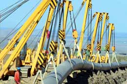 8臺吊管機正在將直徑1.2米的天然氣管道緩緩沉入3米多深的管溝中。在新疆博樂境內的天山腳下,國家重點建設工程西氣東輸二線的建設者們正頭頂烈日緊張施工。西氣東輸二線工程于2008年2月22日開工建設,全長9139公里,途經我國14個省區市。年輸氣量300億立方米,穩定供氣30年以上,是我國首次引進境外天然氣資源、具有戰略意義的特大型天然氣管道建設項目。