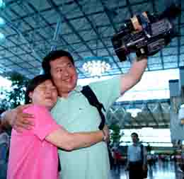 7月13日,臺灣導游潘女士(左)和大陸游客在臺北桃園機場惜別。當日,大陸居民赴臺旅游首發團結束歷史之旅。大陸居民赴臺旅游首發團的680名游客自7月4日開始在臺的旅程,沿途均受到了臺灣同胞的熱情歡迎和接待。幾天來,大陸游客們先后游覽了日月潭、阿里山、墾丁、太魯閣、臺北故宮博物院等知名景點。