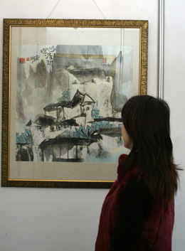 參觀者在欣賞《中國古村落》。新華社記者:高增雙