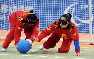 9月7日,中國隊隊員許娟(右)和陳鳳青在比賽中防守。當日,在北京理工大學體育館舉行的北京殘奧會盲人門球女子預賽中,中國隊以5比3戰勝巴西隊,首戰告捷。