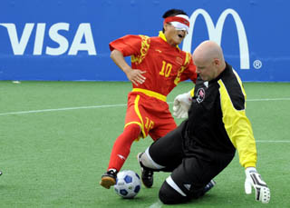 9月7日,中國隊球員鄭文發(左)在比賽中突破遭到對方守門員封堵。當日,在北京2008年殘奧會五人制(盲人)足球小組賽中,中國隊以3比0戰勝英國隊。