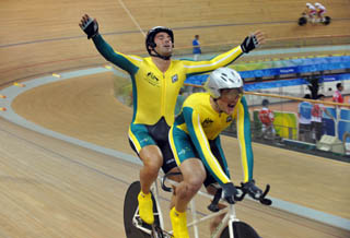 9月7日,澳大利亞選手基蘭·莫德拉(左)與領騎員泰森·勞倫斯慶祝勝利。當日,北京2008年殘奧會場地自行車男子個人追逐賽(B&VI)決賽在老山自行車館舉行,澳大利亞選手基蘭·莫德拉和領騎員泰森·勞倫斯以4分18秒166的成績奪冠,并打破世界紀錄。