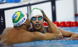 9月7日,丹尼爾·迪亞斯(右)接受隊友祝賀。當日,巴西選手丹尼爾·迪亞斯在國家游泳中心進行的北京2008年殘奧會S5級男子100米自由泳決賽中,以1分11秒05的成績打破世界紀錄并獲得冠軍。