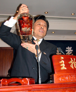 2004年7月一瓶釀于600年前的五糧液以50萬元被拍賣。新華社記者:周俏春 攝