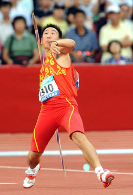 9月10日,中國選手朱鵬凱在比賽中。當日,在國家體育場進行的北京2008年殘奧會男子標槍F11/12級決賽中,朱鵬凱以63米07的成績奪冠,并打破世界紀錄。