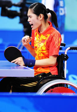 9月10日,中國選手劉靜在比賽中慶祝得分。當日,在北京2008年殘奧會乒乓球女子單打F1-2決賽中,劉靜以3比1戰勝意大利選手帕梅拉·佩祖托,奪得冠軍。