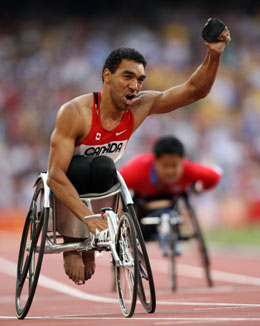 9月10日,加拿大選手伯杰龍在沖過終點后慶祝。當日,在北京2008年殘奧會男子200米T52級決賽中,伯杰龍以30秒81的成績奪冠。