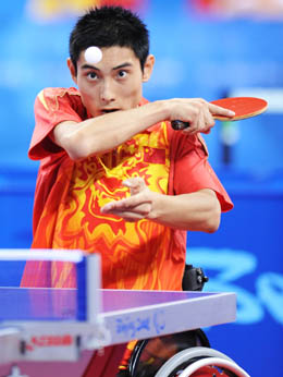 9月11日,中國選手馮攀峰在北京2008年殘奧會乒乓球男子單打M3決賽中,以3比0戰勝法國選手讓-菲利普·羅班,獲得金牌。