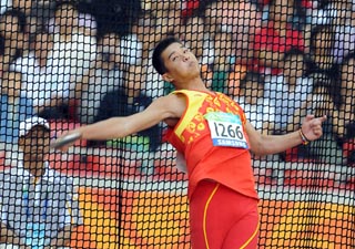 9月11日,中國選手郭偉在比賽中。當日,在國家體育場進行的北京2008年殘奧會男子鐵餅F35/36決賽中,郭偉以54米13的成績獲得冠軍并打破世界紀錄。