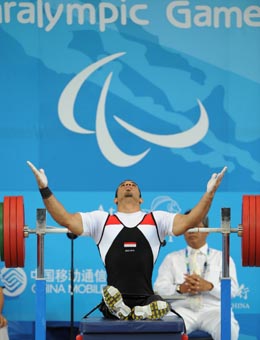 9月11日,謝里夫·奧斯曼·奧斯曼在試舉前祈禱。當日,在北京2008年殘奧會舉重男子56公斤級比賽中,埃及選手謝里夫·奧斯曼·奧斯曼三次試舉均打破世界紀錄,最終以202.5公斤的成績奪冠。
