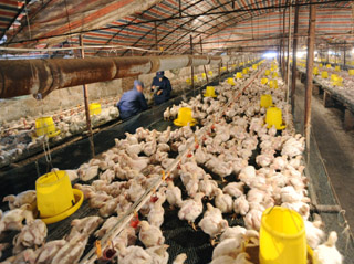 出口禽肉是河南省食品農產品出口項目中的大宗商品,河南出入境檢驗檢疫局對出口禽肉企業實行檢驗檢疫人員長期派駐到廠,并從生產、加工全過程同步進行質量跟蹤服務和監督檢查,確保出口禽肉的質量安全。圖為河南大用集團一個養雞場的兩名工作人員按照河南出入境檢驗檢疫局要求對肉雞進行統一模式的管理。