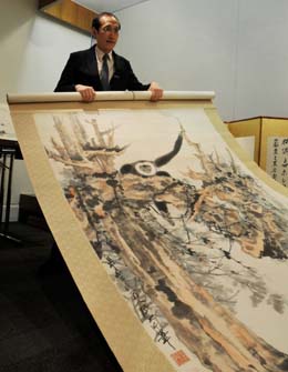 香港蘇富比工作人員在介紹張大千的作品《老樹騰猿》。新華社記者:孫浩