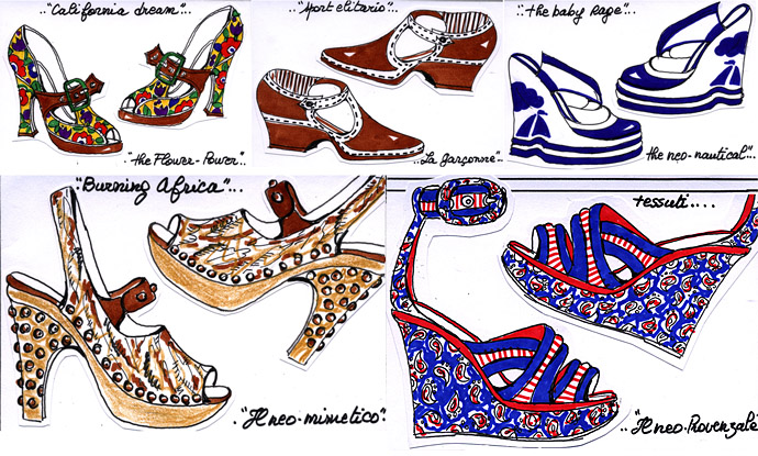 Premoli指出,鞋類流行趨勢將回歸到一個幽雅的、誘人的嬌柔狀態。保留著坡跟和平穩,但二者在形狀上加以結合并比過去要輕,非常完美地闡釋了古典嬌柔的風格。但這些形狀需要重新設計以適合比例、材料和色彩效果。在外形裝飾上,通常使用珍珠和珍珠母,以減輕重量,便于成型。本季金屬色仍很重要但不再注重閃亮;復古風在這一季表現得較為突出。前開口依然流行。在這一季里,運動鞋將呈現更為雅致的風格。運動裝束卻從不是為了運動,只為舒適又很奢華。面料以皮革和織物為主,裝飾以帶子和格子織物式樣。寬跟設計更體現其舒適性。