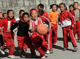 云南省迪慶藏族自治州德欽縣示范小學的學生正在打籃球。