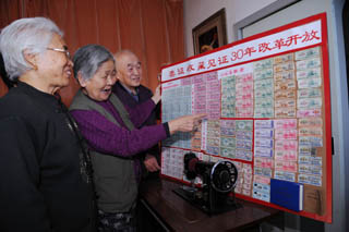 董化銘老人指著展板上的各類票證回憶起往事:“在那個年代,不僅人們收入微薄,而且物資匱乏,一切東西全部都要憑票證,實行計劃供應! 各類票證充斥著人們的生活,糧票、肉票、布票、鹽票、油票、煙票、……就連買糖果、糕點、火柴、肥皂也要憑票,票證漸漸成了城鄉居民吃飽穿暖的一種保障。一個家庭所有生活必需品都離不開各種票證,在當時誰家要是把票證丟失了,就意味著這個月可能沒有肉吃沒有衣穿了。 一個好的當家人不僅要計算著每月幾十元工資如何養活一家數口人,還要精打細算精心管理如何使用一個月內各種票證,每人每月供應三兩油,根本就不夠吃,每日飯菜很少吃到油香味,所以家里買肉時都挑肥的。當年的米面約0.15元一斤,豬肉約0.74元一斤,都得憑票購買,那時候的人們都是‘等米下鍋’,只等票兒一到手,迫不及待就要去買米,沒有票,人們拿錢也買不到這些東西。老人說,家里至今仍保存著的一臺燕牌縫紉機就是憑當年的票證買的。 董化銘老人還告訴記者:“之所以現在還能留下這么多糧票,并不是因為當年家里富余吃不完,而是因為過去糧食少,經常有票也買不上,所以這些糧票才會剩在手里!