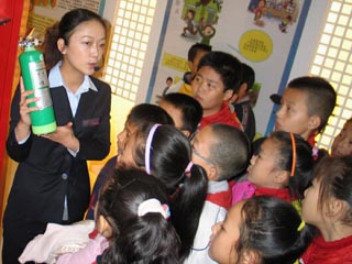 全國消防日即將來臨,新疆消防科普教育基地在烏魯木齊創建,今后新疆所有消防科普教育基地(站點)將定期向社會免費開放,以增強全民消防安全意識。圖為11月6日,新疆消防科普教育基地講解員向一群小學生介紹滅火器使用方法。