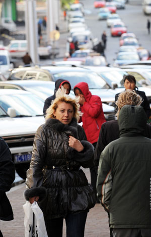 俄羅斯游客在綏芬河市街頭。本報記者:王建威