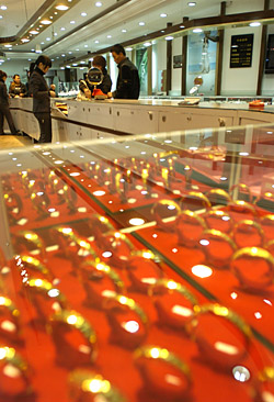 據了解,黃金依然是珠寶首飾市場最熱銷的產品,約占珠寶類產品1/5的市場。 記者近日在北京國華商場看到,如今純金首飾不再是簡單的素圈、車花品種,擁有許多百變造型,還能實時調價。在有著“京城黃金第一家”的菜市口百貨商場黃金柜臺旁,不少消費者擠在黃金柜臺前選購黃金飾品,而二樓的鉆石、寶石柜臺前則顯得冷冷清清。菜百公司業務部經理李翔介紹,由于黃金飾品兼具觀賞與保值的功能,所以近期經濟增速放緩,而黃金首飾的銷量卻一路走高。 為了抵御通貨膨脹以及經濟風險,不少消費者購買黃金飾品來保值。據統計,今年“十一”黃金周,各主要市場的黃金珠寶銷售與去年同期相比都出現了較大幅度的增長,菜百七天假日實現銷售額近7000萬元,老鳳祥、老廟黃金的銷售額分別達到7546萬元和6434萬元。專家預計,今年黃金銷售還將繼續保持較快速度的增長幅度。 |