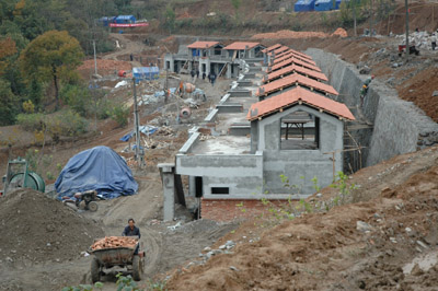 略陽縣是陜西省地震重災區之一。全縣共有9200多戶農戶住房在地震中倒塌或損毀,需要重建。目前略陽縣應重建的9000多戶農村居民中,已建成4623戶,其中入住1096戶,正在進行主體建設的達4277戶。圖為略陽縣徐家坪鎮徐家坪村正在建設中的重建房。
