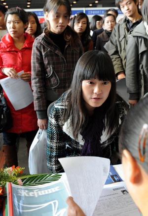 11月20日,畢業生在與用人單位代表洽談。 當日,“江蘇省暨南京市2009屆普通高校畢業生公益供需洽談會”在南京國際展覽中心舉行,近千家用人單位為畢業生提供有效需求職位四萬多個,參會用人單位及數萬應聘畢業生均免費入場。江蘇省2009年高校畢業生總數將達45.8萬人,比2008年增加約3萬人,畢業生人數再創歷史新高。