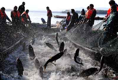 河南信陽南灣水庫生態魚冬季捕撈日前開始,第一網就捕撈了兩萬多斤鰱魚。南灣水庫可養殖水面有7萬畝,每年投入魚苗20萬公斤,采用人工放養和生態喂養的辦法,年捕撈魚類180萬斤,另有60萬斤魚苗供水庫內各種鳥類捕吃,以維護生態平衡。
