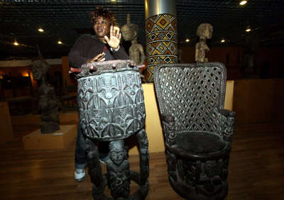 11月24日,由中非文化交流中心和北京橋藝術中心聯合主辦的“原始藝術與現代生活——非洲藝術精品展”在北京開箱布展。圖為一位非洲藝術家在介紹非洲近200年的巴姆雷克族酋長王座和非洲酋長禮器鼓。