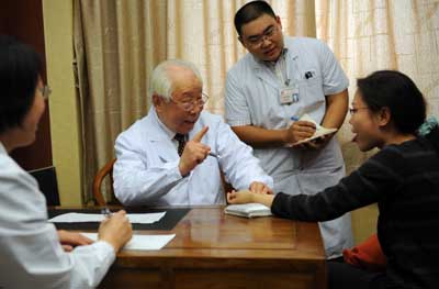 11月28日,北京醫院中醫科主任、90歲的著名老中醫李輔仁(左一)在為患者診病。據介紹,北京醫院中醫科涌現出新一批名中醫和中西醫結合專家,每年診治患者約10萬人次。新華社記者:李曉果