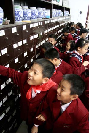 中醫學者建議在中小學教材中加入中醫藥常識專題,以加大中醫知識普及力度。圖為安徽小學生參觀中藥房。程千俊