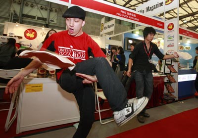 12月4日,2008中國國際食品及酒店設備用品博覽會在上海新國際博覽中心開幕,來自美國、英國、日本、新加坡等25個國家和地區的近750家食品企業參展。本屆展會的展出面積達8000平方米,展出了各國風味的食品、飲料,參觀者在大飽眼福的同時也能免費品嘗各種美味。圖為一名廚師正在展會現場制作比薩。