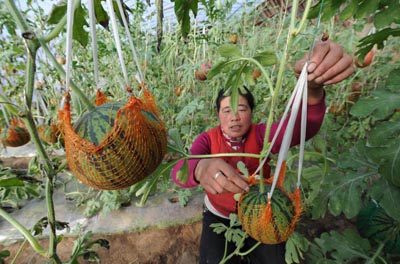 甘肅省皋蘭縣西岔鎮陽洼窯村一位農民在日光溫室內查看反季節西瓜的生長情況。