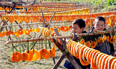 12月9日,江西婺源縣賦春鎮甲路村兩個孩子在晾曬南瓜干的田間玩耍。