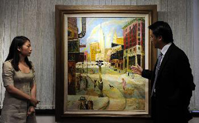 佳士得拍賣行的工作人員在秋拍前介紹畫家朱沅芷的作品《歡樂節慶的百老匯》。新華社記者:呂小煒