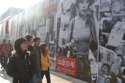 “長安杯”紀念改革開放30周年全國攝影大展定于12月16日在北京王府井步行街舉行。圖為人們從大展活動巨幅宣傳牌前走過。