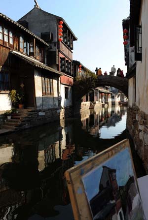 一名美術愛好者剛完成的寫生畫與周莊美景相映成趣。本報記者:楊磊 攝 |