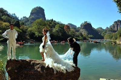 一對新人在福建武夷山九曲溪畔拍攝婚紗照片。本報記者:張國俊
