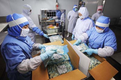 山東諸城外貿集團的員工在包裝出口到荷蘭的熟制雞肉產品。近日,山東九家企業已恢復對歐盟國家出口熟制禽肉產品,這標志著時隔六年后中國熟制禽肉產品開始重返歐盟市場。2002年,歐盟以進口中國部分動物源性食品未達到其要求為由,全面禁止從中國進口動物源性產品。經國家和山東有關部門長期努力,歐盟委員會終于在前不久通過決議,批準歐盟成員國恢復山東九家企業的熟制禽肉制品。