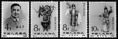 1962年發行的“梅蘭芳舞臺藝術”紀念郵票共8枚,除第一枚4分的圖案為梅蘭芳像外,其余7枚都選用梅蘭芳生前不同時期在舞臺上塑造的具有代表性的藝術形象為圖案。 “梅蘭芳舞臺藝術”紀念郵票中的4枚(自左至右):第一枚4分,圖為梅蘭芳像;第二枚8分,“抗金兵”里的梁紅玉;第三枚8分,“游園驚夢”里的杜麗娘;第四枚10分,“霸王別姬”里的虞姬。新華社發