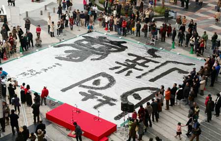 1月4日,日本書法家在廣島用長1.8米、重20公斤的毛筆在絲綢上書寫巨幅書法作品,以表達對新年的美好愿望。