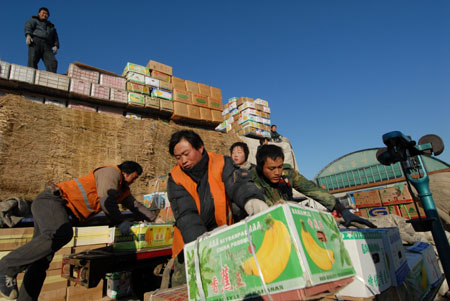 1月12日,工人在北京新發地農產品市場搬運水果。