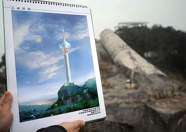 圖左為“三峽明珠觀光塔”效果圖,圖右為“三峽明珠觀光塔”廢墟。本報記者