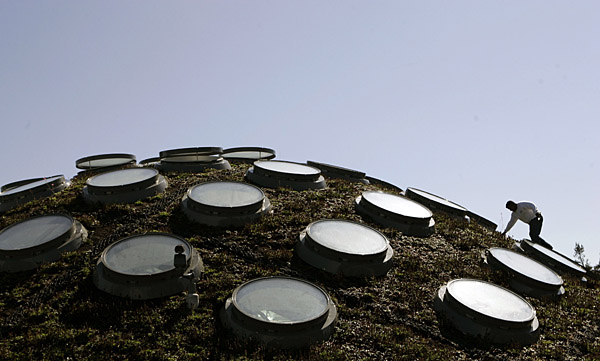 在美國加利福尼亞州的舊金山市,一名工人爬上科學研究院的“活屋頂”,所謂“活屋頂”便是在現代建筑的頂部種草以增加綠植覆蓋,減少溫室氣體。新華社發 |