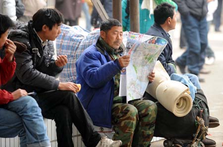 1月30日,求職民工在南京安德門民工就業市場找工作。當日,南京市安德門民工就業市場結束春節假期重新開市,來自各地的大批民工早早進場尋找工作。該民工就業市場的70多家職介所共準備了2萬多個崗位,迎接民工節后進城求職。