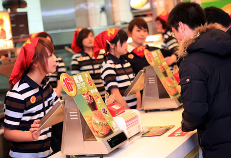 2月4日,麥當勞(中國)有限公司在上海宣布,將在全國范圍的餐廳推出16.5元“天天超值套餐”。據稱,該系列套餐的價格優惠高達32.6%。此舉顯示洋快餐巨頭為刺激銷量增長,以“超值套餐”的促銷方式調低產品的實際售價。圖為顧客在上海一麥當勞餐廳內購買食品。